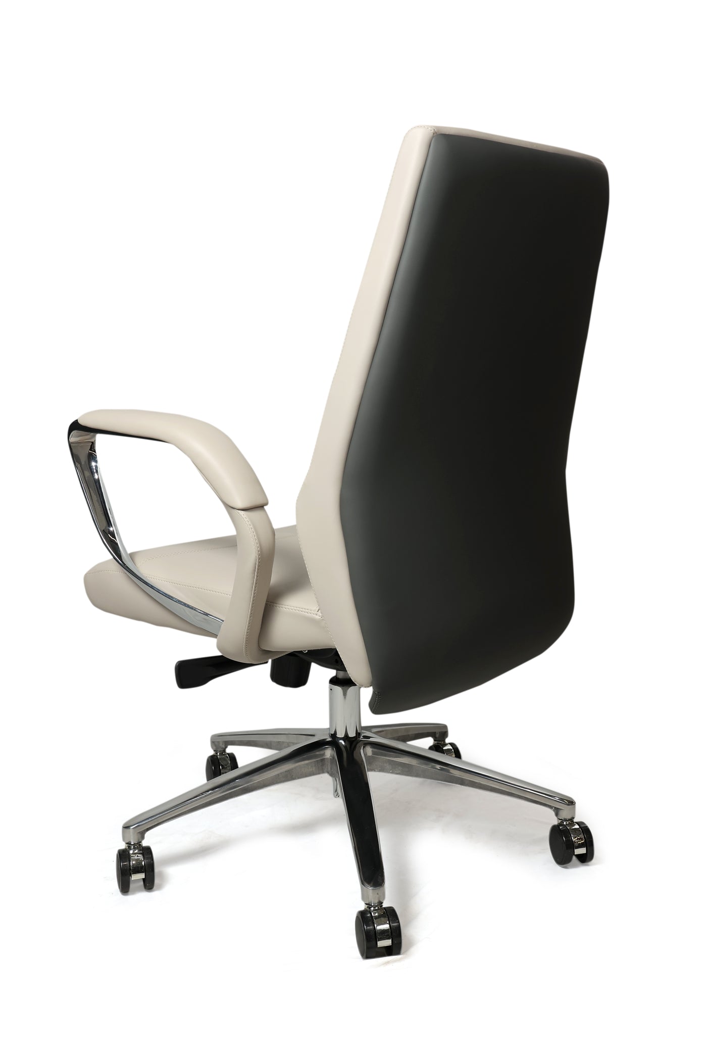 Made with genuine leather with multiblend plywood, with aluminum dye casted armrest with leather padding upholstery, extra cushion padding in backrest for lumbar support, with aluminum dye casted pedestal base with 65MM twin castor wheels and dunati 4-position multilocking mechanism